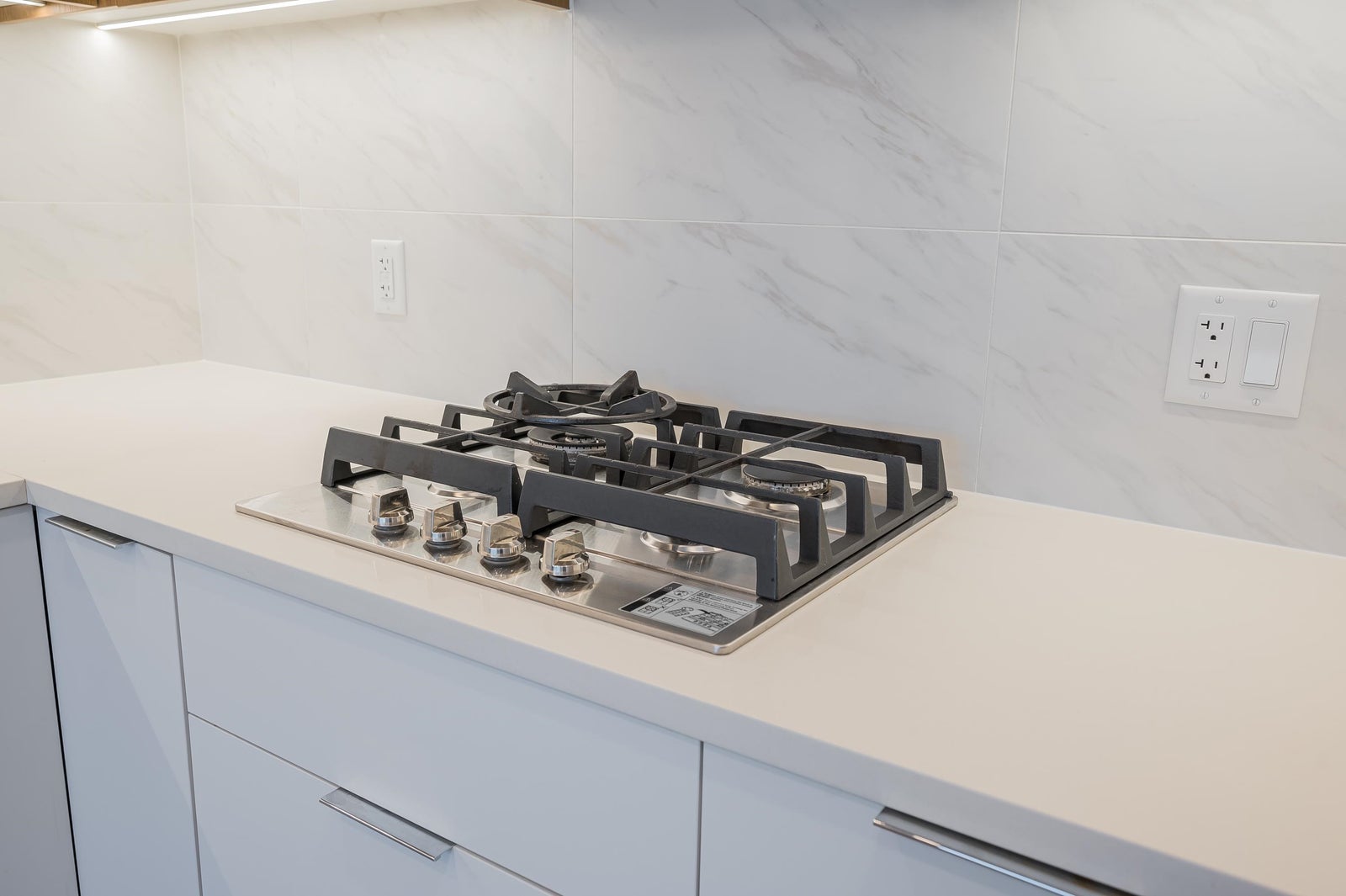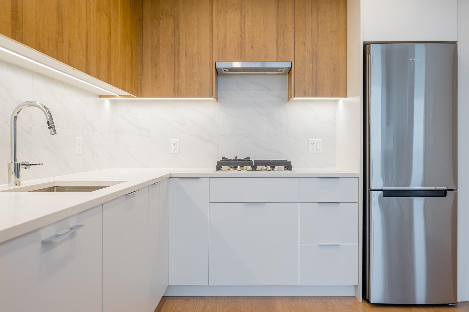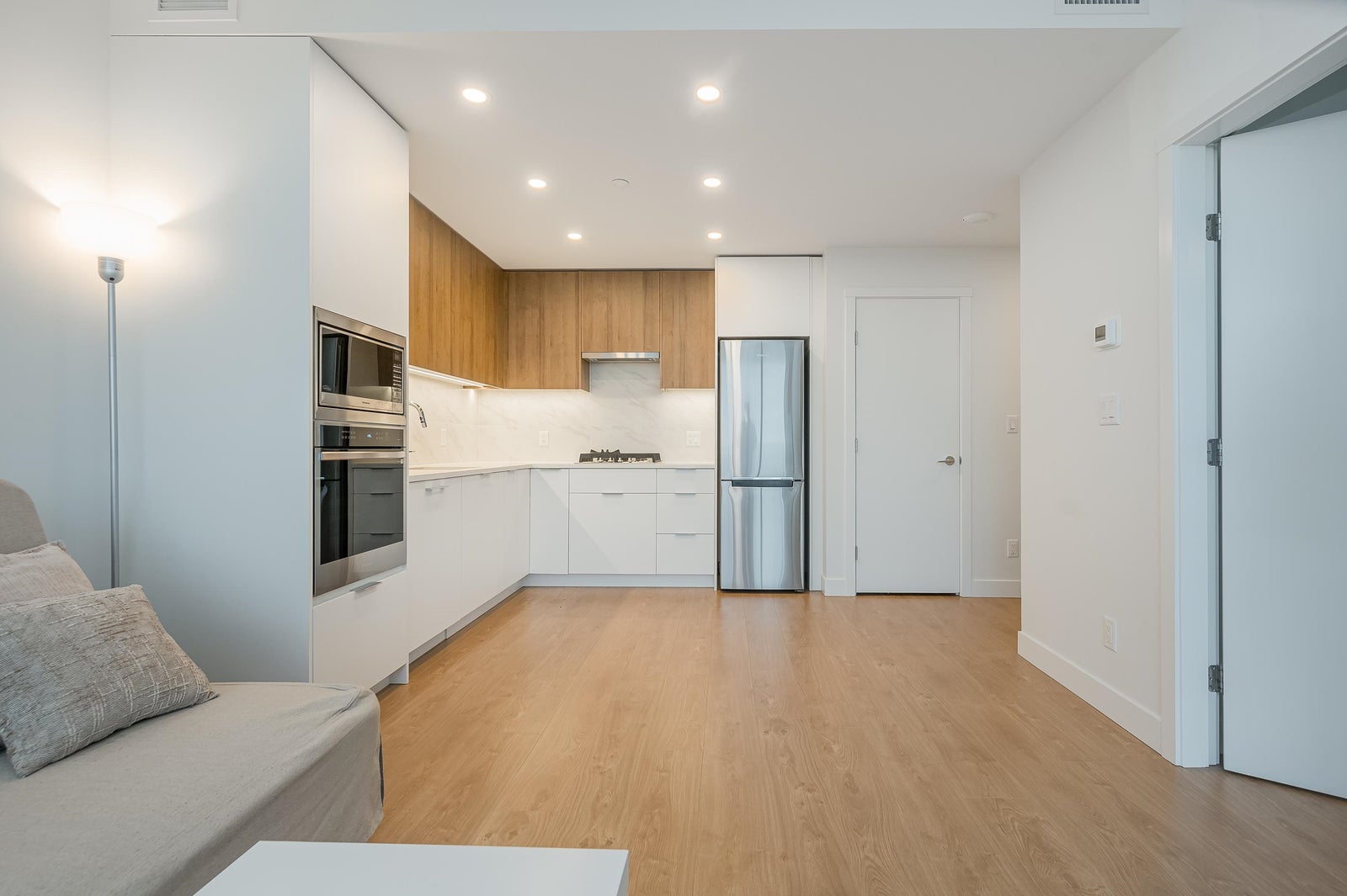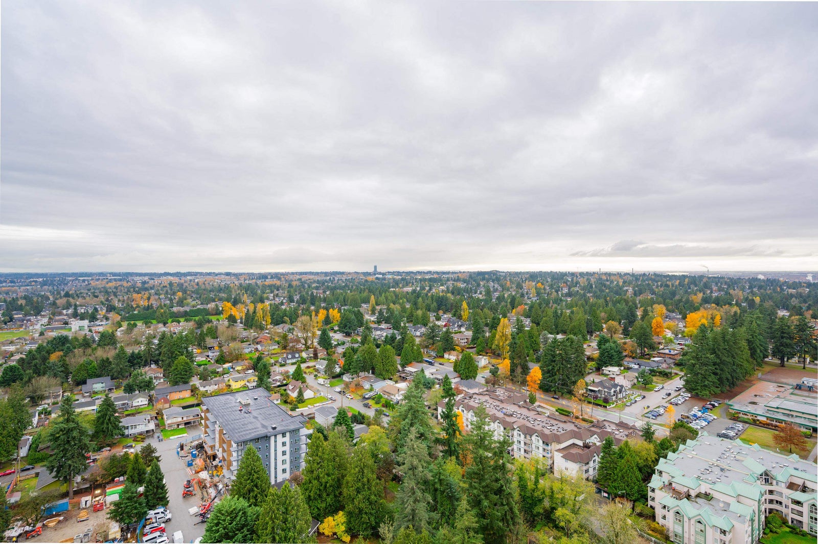 Experience breathtaking southwestern views spanning the city skyline, mountains, and Gulf Islands from this PENTHOUSE unit at The Holland by Townline! This owner occupied top floor 1 bed, 1 bath, 500 sq. ft. home features an efficient open layout, complete with A/C. The modern kitchen showcases Samsung appliances including gas range, quartz counters and ample storage. Bright living area with wide plank flooring opens to the balcony. Steps to SkyTrain, SFU, Central City Mall and Holland Park. Building amenities include gym, co-work/meeting rooms, party lounge and concierge. Ideal for first-time buyers or investors. 1 parking + 1 locker included.