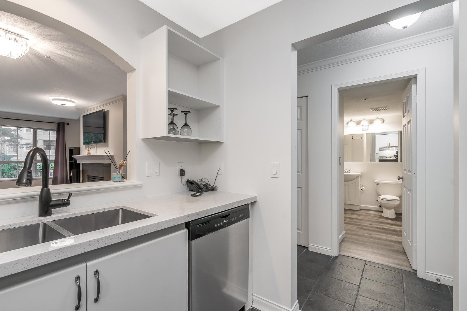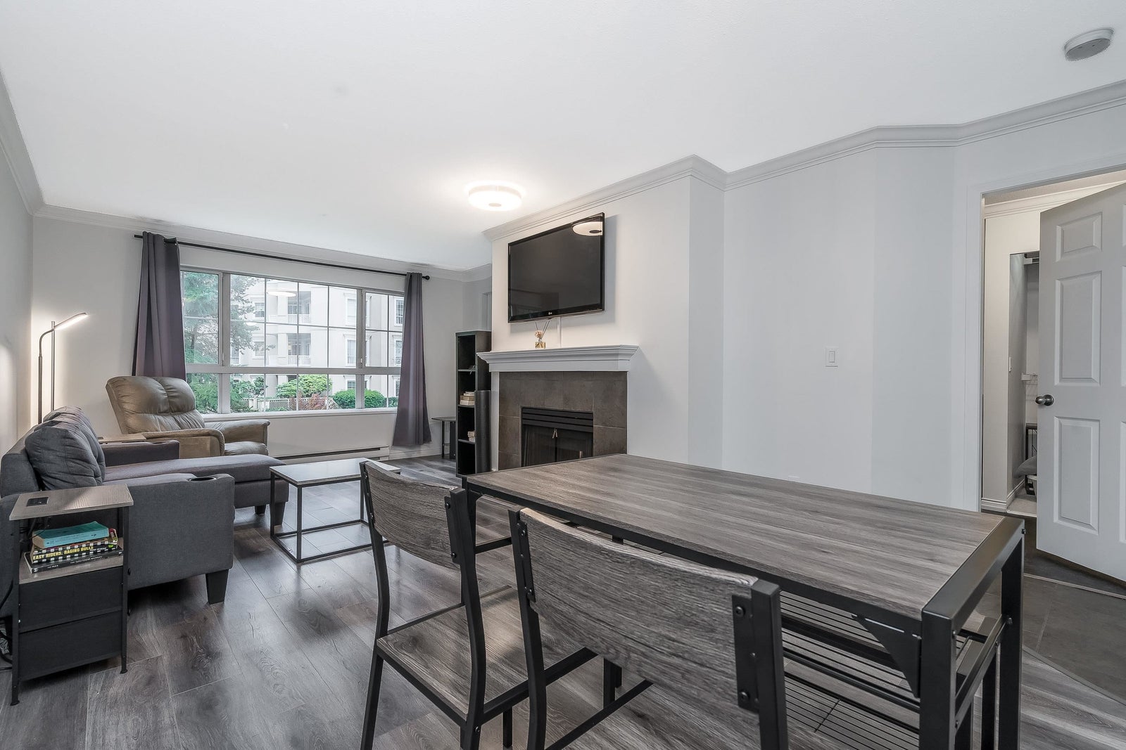 Bright and peaceful 1 bed, 1 bath, 739 sqft home in The Jefferson overlooking the tranquil Hoy Creek hatchery and forest. This spacious suite features a large living area with a gas fireplace, crown moulding, newer appliances, and a kitchen with quartz countertops and generous storage. Enjoy a private balcony surrounded by nature and an oversized bathroom with a deep tub. Ideally located in the heart of Downtown Coquitlam, just steps to SkyTrain, Coquitlam Centre, Lafarge Lake, the Aquatic Centre, and parks and trails. A quiet, secure community close to everything you need.