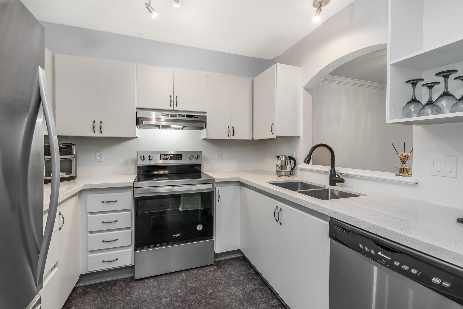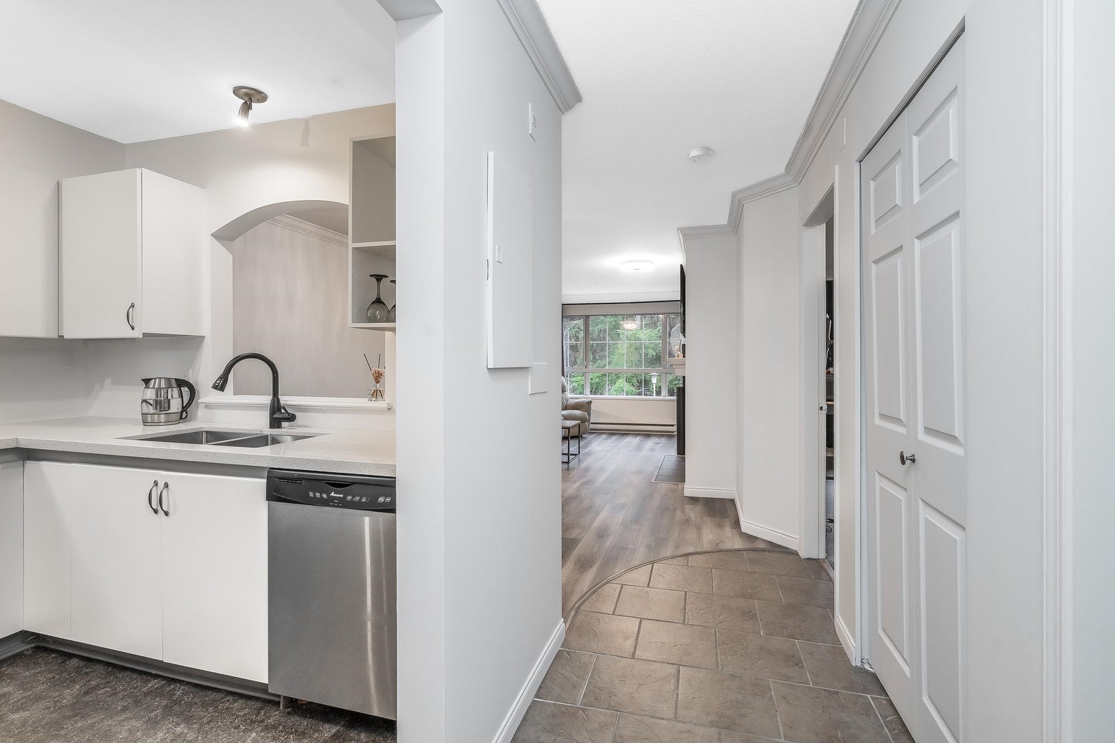 Bright and peaceful 1 bed, 1 bath, 739 sqft home in The Jefferson overlooking the tranquil Hoy Creek hatchery and forest. This spacious suite features a large living area with a gas fireplace, crown moulding, newer appliances, and a kitchen with quartz countertops and generous storage. Enjoy a private balcony surrounded by nature and an oversized bathroom with a deep tub. Ideally located in the heart of Downtown Coquitlam, just steps to SkyTrain, Coquitlam Centre, Lafarge Lake, the Aquatic Centre, and parks and trails. A quiet, secure community close to everything you need.