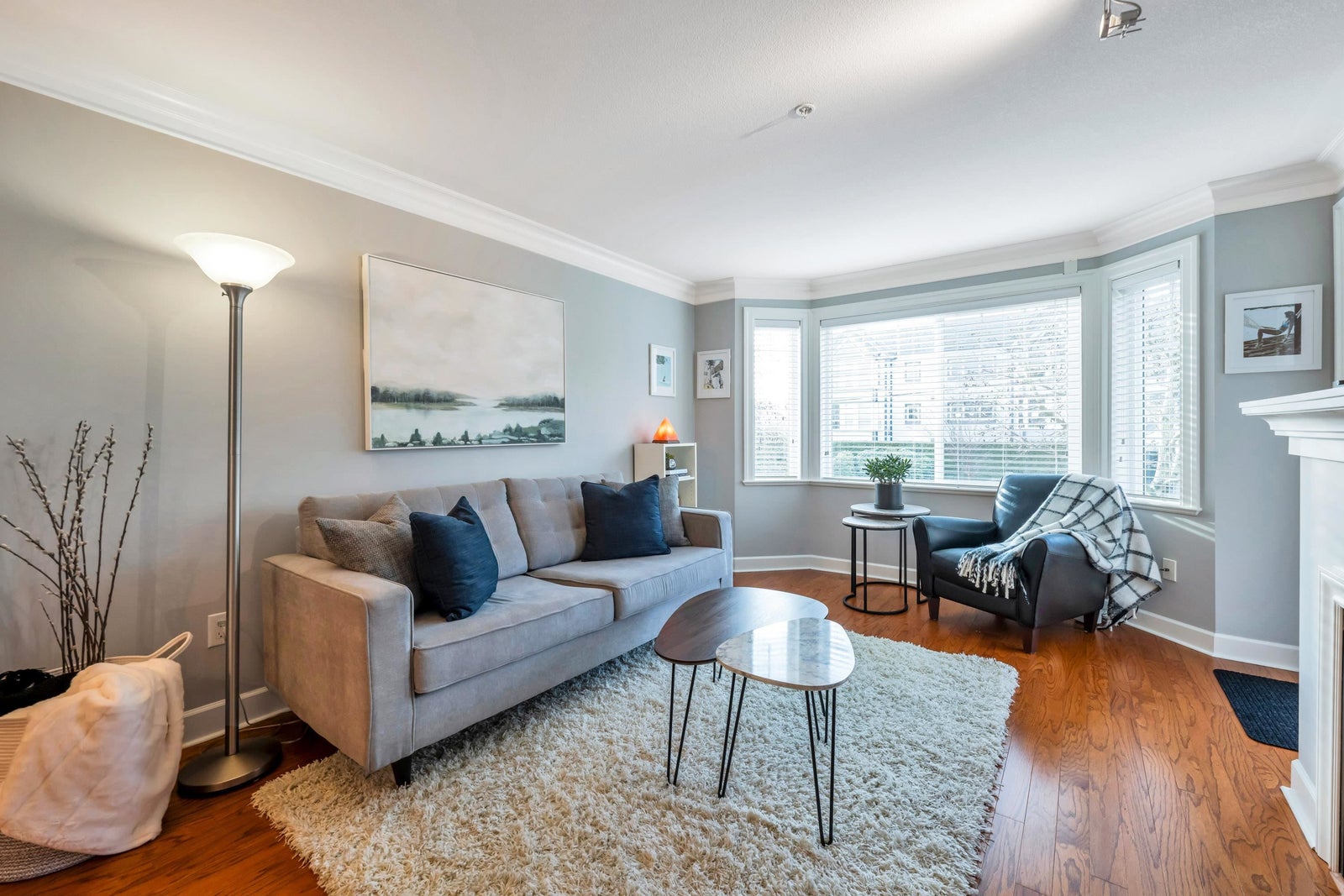 EXCEPTIONAL CRAFTSMANSHIP & LUXURY! This elegant, immaculate, 724 sq. ft., west facing open concept floor plan features beautiful hardwood floors, crown mouldings, electric fireplace, peninsula kitchen, stainless steel appliances, & granite countertops. Enjoy stunning sunsets from spacious living room bay windows, balcony facing quiet landscaped street with peek-a-boo ocean view. Brand new Mysa Smart thermometers, A/C, & W/D in walk-in laundry/storage room with custom maple pantry. Exceptionally managed, Brand new carpet/paint updates. 1 storage/1 parking/pets/rentals allowed/no age restrictions. Amenity room, bike room, guest suite. Walking distance to beach, promenade, library, shops, restaurants, transit, schools, hospital, recreation & more! A must-see gem in the heart of White Rock!